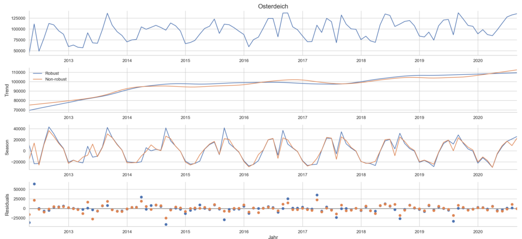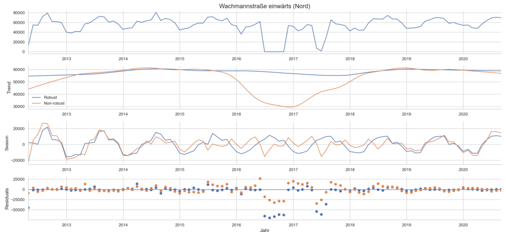 Im Gegensatz zum ersten Einblick in die Daten habe ich die Datensätze etwas besser „vorbereitet“. Das erste Auftreten eines Wertes über Null in 2012 wird nun als Startzeitpunkt der Messungen betrachtet und der Datensatz wurde dementsprechend „gekürzt“. Werte die nicht zu vollen Stunden auftraten sind nun richtig indexiert. Die Ausreißer wurden aus dem Datensatz entfernt.